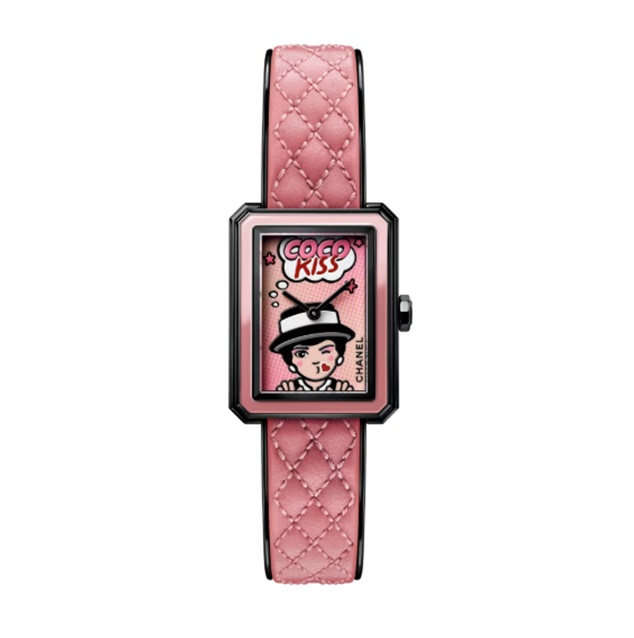 Interchangeable pink quilted calfskin leather strap with black patent leather trim, black leather lining and black-coated steel ardillon buckle