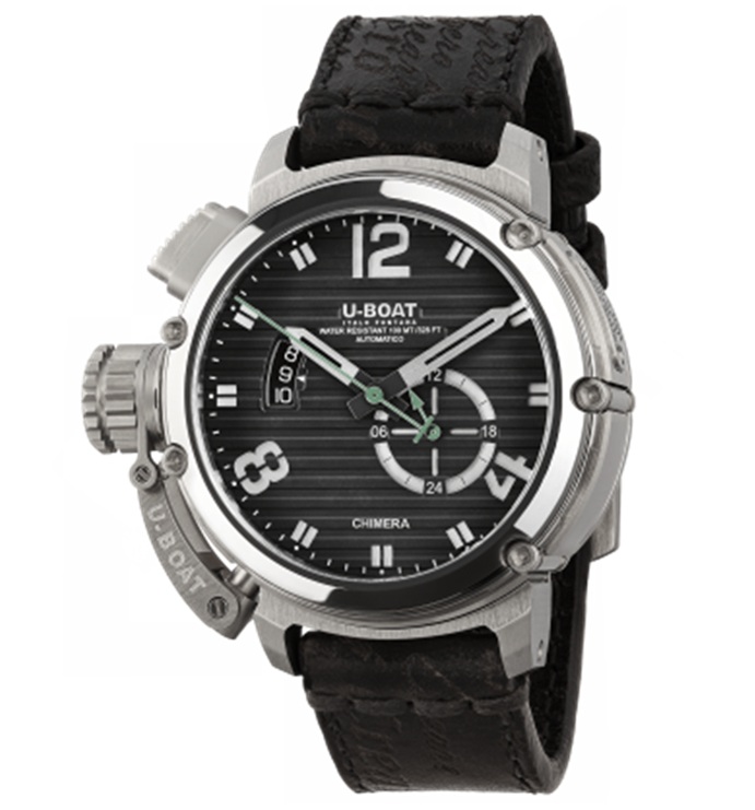 Swiss automatic mechanical ETA 2824 Top Soigné, elaborated and modified according to U-BOAT specifications. Frequency 28,800 alternations/hour (4Hz). Power reserve 38 hours. 25 jewels. U-BOAT rotor in brass and tungsten, perlage processing and rhodium-plated. Screwed bridges.