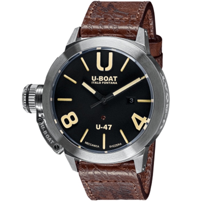 Swiss automatic mechanical, personalized to U-BOAT specifications for stem to be positioned at 9 o’clock. Frequency: 28,800 vibrations per hour, 4 Hz. Power reserve: 41 hours. 26 jewels. Skeletonized rotor as by U-BOAT specifications.