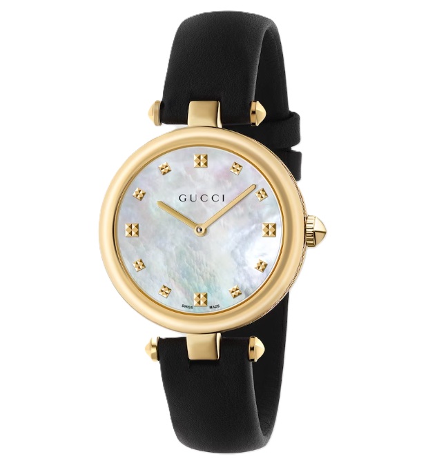 Light yellow gold PVD case with white mother of pearl dial, black leather strap.