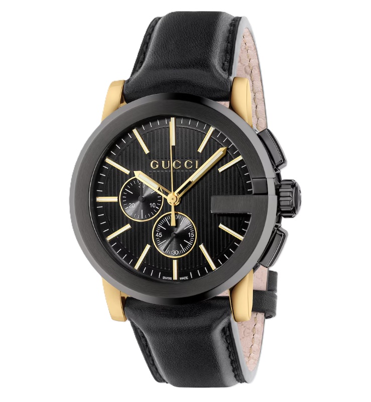 Black and light yellow gold PVD case with black guilloché dial, black leather strap