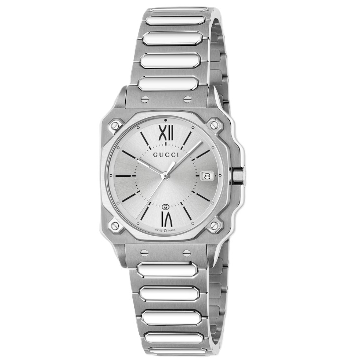 Silver galvanized dial with roman indexes at 12 and 6 o’ clock and date at 3 o’clock