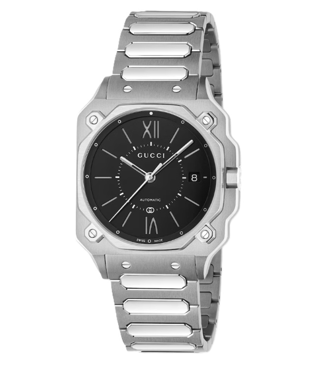 Black opaline dial with with roman indexes at 12 and 6 o’ clock and date at 3 o’clock