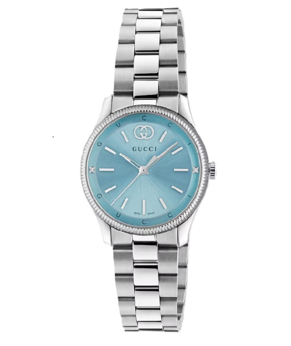 Blue dial with two diamonds, Interlocking G detail and Gucci lettering