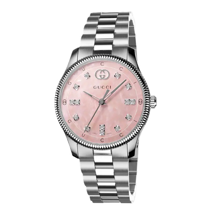 29 mm stainless steel case, pink mother of pearl dial with Interlocking G and Gucci lettering, diamond indexes, stainless steel bracelet