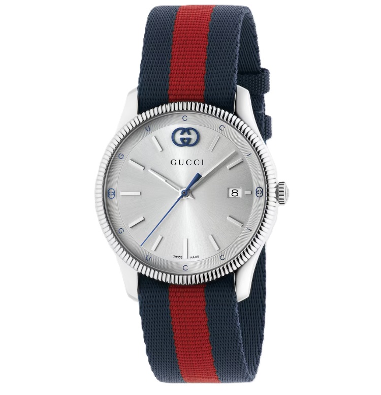 Silver-toned dial with Interlocking G, Gucci logo, date at 3 o’ clock