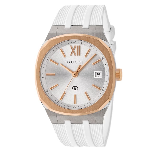 Pink gold-plated bezel, silver dial, Interlocking G detail, Gucci logo and date opening