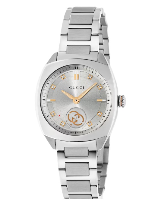 29mm stainless steel case, silver sunbrushed dial with 8 diamonds and pink gold-plated details, Interlocking G small seconds display, stainless steel bracelet
