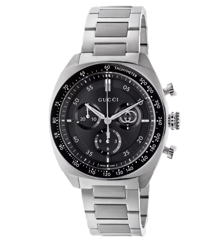 41mm stainless steel case, black dial, Interlocking G small seconds display, black ceramic bezel with tachymeter indication, stainless steel bracelet