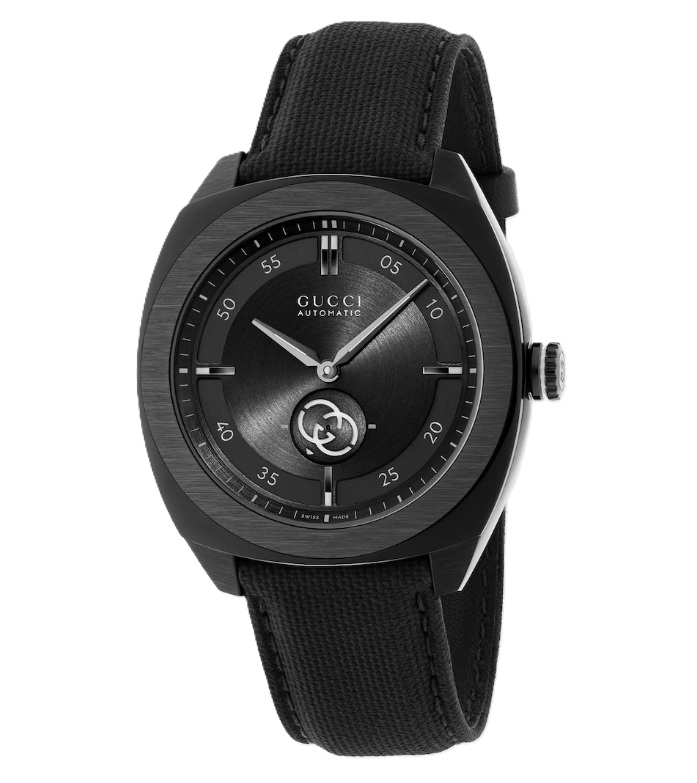 41mm stainless steel case with black PVD coating, black dial, Interlocking G small seconds display, black PVD bezel and black rubber strap with textile effect