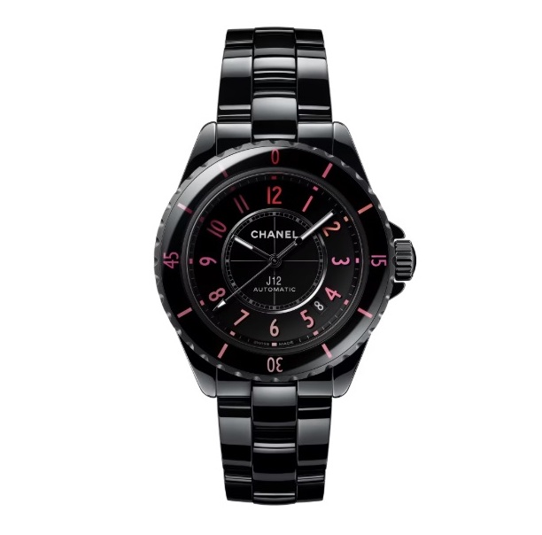 Matte black-coated steel unidirectional rotating bezel and black-varnished sapphire crystal ring with indicators in shades of pink and red