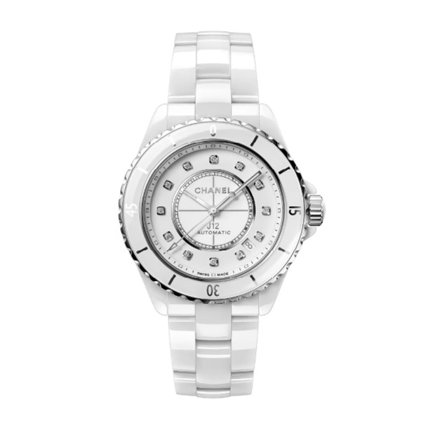 White-lacquered dial set with 12 diamond indicators (~0.09 carat)
