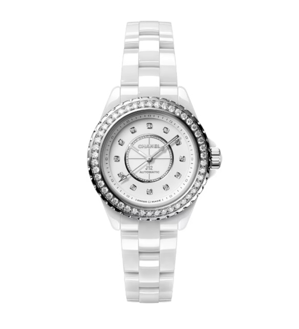 White mother-of-pearl dial set with 12 diamond indicators (~0.06 carat)