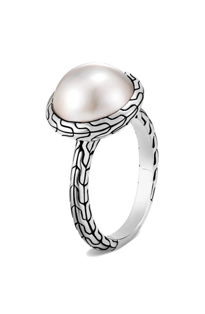 Classic Chain Silver Small Ring with Mabe Fresh Water Pearl. Engagement rings exclude center diamond unless otherwise stated. The photo may include a center diamond for illustrative purposes only.