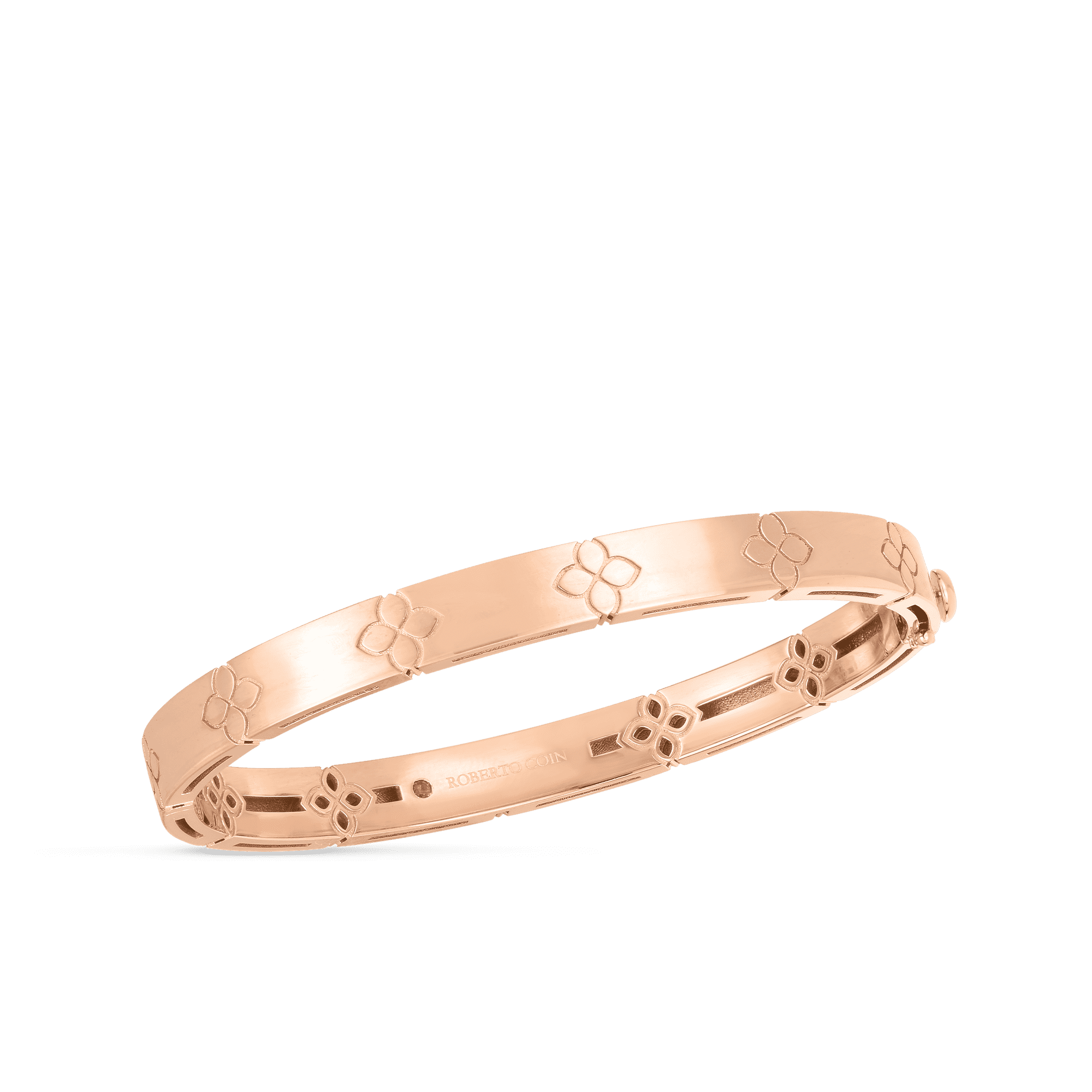 Roberto Coin Rose Gold Love in Verona narrow Width Bangle 18k Rose Gold Hinged Bangle with Hidden Safety Clasp Bangle measure 4.5mm wide Standard Size measure 48mm x 58mm 7773203AXBA0
