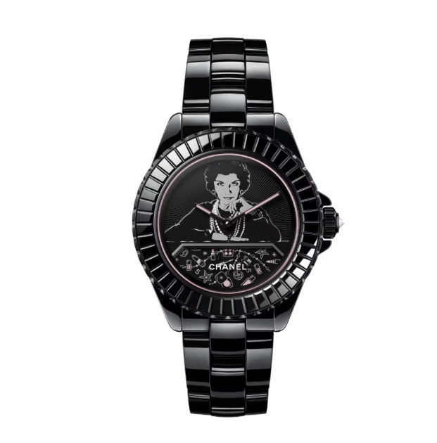 Dial with a fixed illustration of Mademoiselle and a black-varnished rotating disc decorated with silver and pink-powdered printed makeup motifs, completing a lap in 5 minutes
