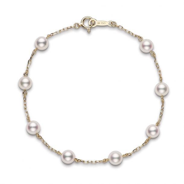 The pieces are designed to be worn on their own as a statement, or layered with other classic MIKIMOTO designs for a more detailed look. This bracelet features Akoya cultured pearls set in 18k yellow gold and is 7″ in length.