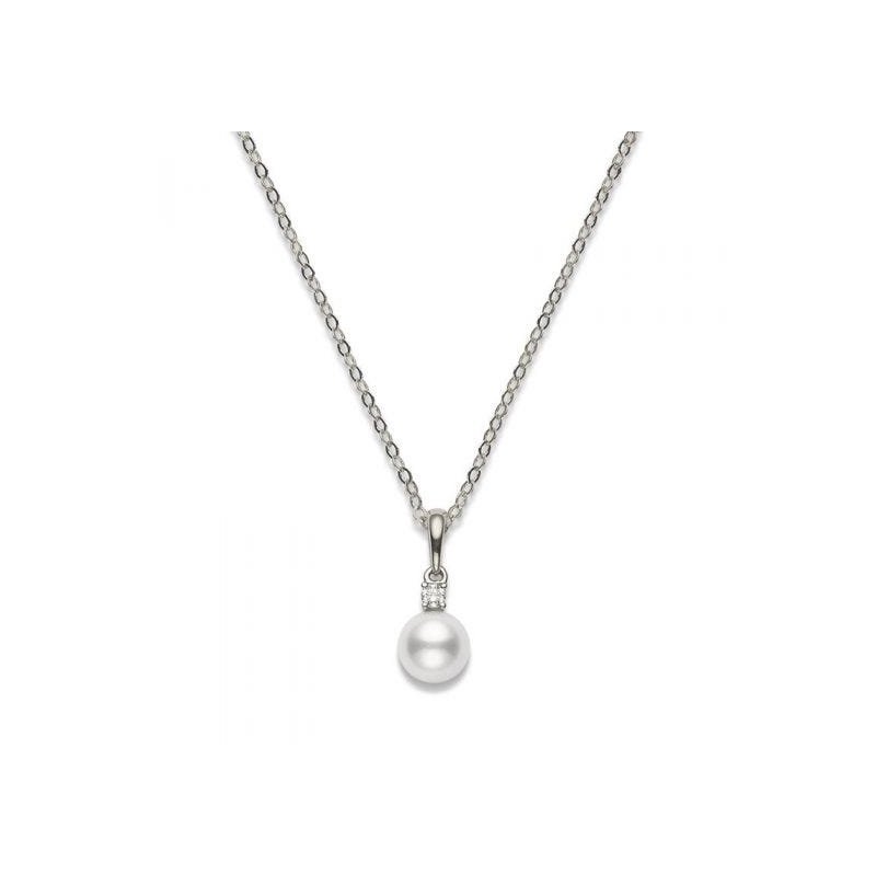 18kt white gold necklace featuring 1 white Akoya pearl, 7.5x8mm, A+ quality and 1 diamond of 0.10ct. Length 18”.