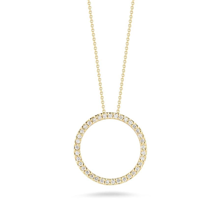 From Roberto Coin this beautiful 19mm pendant is made from 18k yellow gold and is lined with precious shimmering diamonds. It hangs from a quality link 18″ chain and features the designer’s signature ruby on the clasp, making this piece an unmistakable premium item from Roberto Coin.