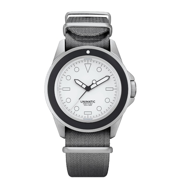 The Modello Uno ref. U1-FL is an Italian-made dive watch, featuring, for the first time, a fully luminescent white dial with a green glow. Its clean design reflects Italian rationalism, highlighted by a minimalist matte black open second track and dial accents.