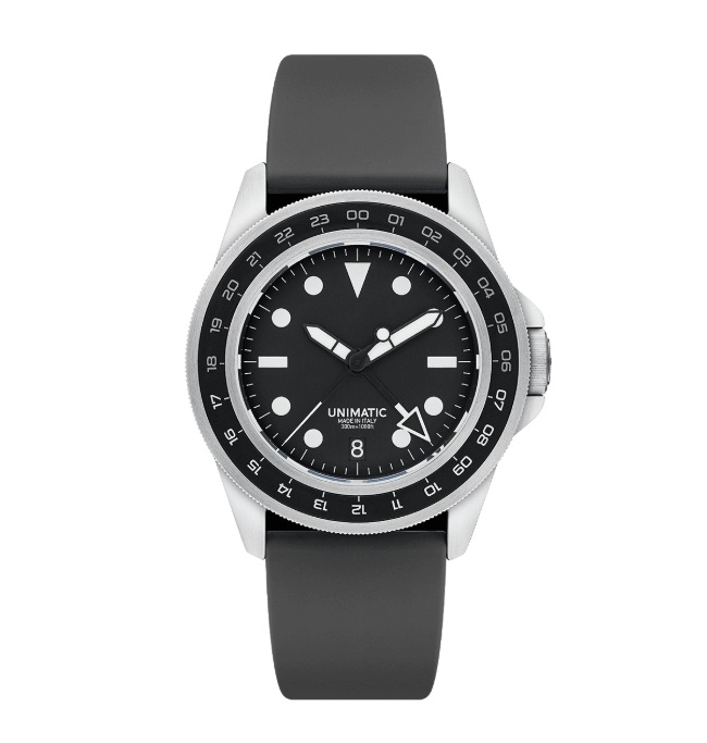 The Modello Uno ref. U1-GMT is a limited edition military watch equipped with a Japanese automatic GMT movement. The matte black dial matching the 24h bezel, makes it the perfect dual-time watch for everyday wear.