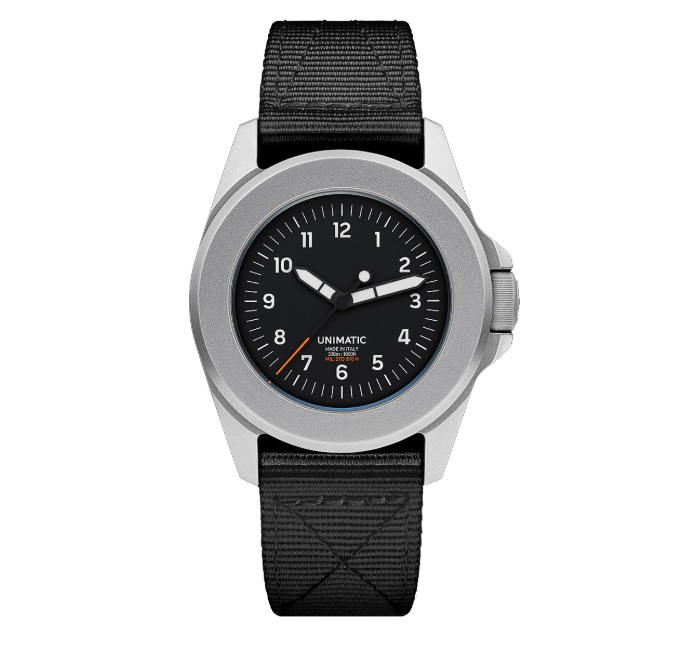 The solid sandblasted stainless steel case, the screwed-in 2mm thick caseback, the 8mm diameter crown together with the high quality gaskets set provide a water resistance tested individually to 30 atm=300m=1000ft. Timing accuracy is guaranteed by the Quartz VH31 movement with a hacking / sweeping second hand, fitted with a Made in Italy TPU anti-shock system. It comes on a black nylon keeper two-piece strap with stainless steel sandblasted hardware signed UNIMATIC, that fits in the 22 mm lugs.